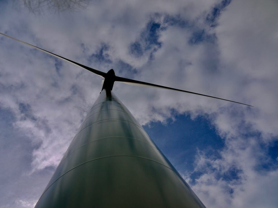 Avec le pale occulté, la photo est plus abstraite,d’aucuns s’attendant, pour une éolienne, à en compter trois. Cela, additionné à l’angle de prise de vue, en forte contre-plongée, ainsi qu’au bleu cobalt du ciel, produit une photo saisissante.