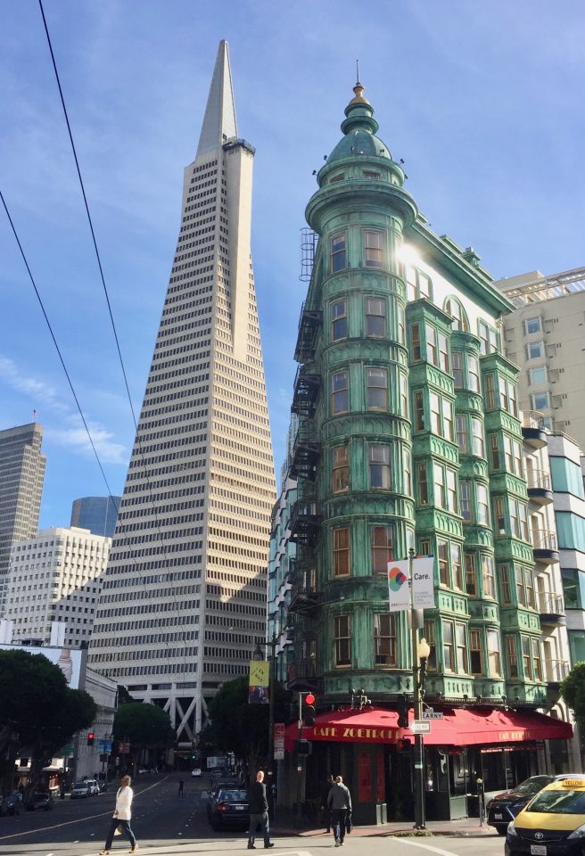 En deuxième plan sur la photo, on peut voir la Transamerica Pyramid ou Transamerica Tower (Architecte : William Pereira). Achevé en 1972, cette tour aura été longtemps la plus haute de San Francisco (324 mètres, dont 64 d’antenne) jusqu’à ce que la Salesforce Tower (326 mètres), en cours d’achèvement, la dépasse.