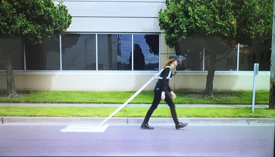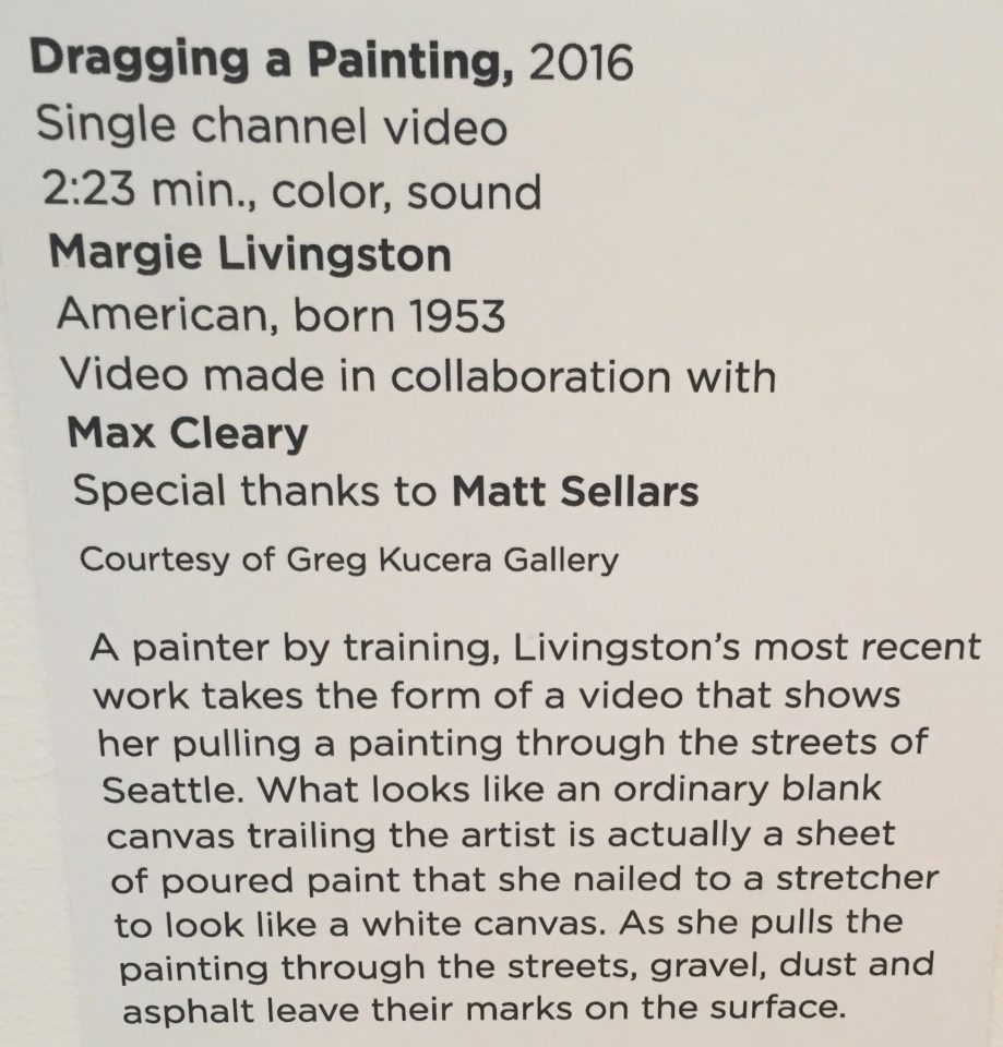 Le processus de création est entièrement dans le titre : « Dragging a Painting ». Madame Livingston ( I presume ? ) a versé de la peinture sur une feuille de papier qu’elle a montée sur un châssis. Elle l’a accroché à un harnais qu’elle a enfilé avant de faire de même avec les rues de Seattle ( attention : quasi zeugma ! ) en le trainant par terre. Au cours de la promenade, comme le dit le cartel de l’œuvre, les graviers, la poussière et l’asphalte ont laissé leurs marques sur la surface peinte créant ainsi une œuvre originale. Mais c’est pas tout. Par la même occasion, Madame Livingston, a demandé à son vieil ami Monsieur Cleary de filmer sa balade, ce qui a donné l’œuvre vidéo qui défile en boucle sur un mur du SAM. On a donc deux œuvres pour le prix d’une : la toile et le film. Curieusement, le musée n’expose pas la feuille papier peint sali. Trop chère probablement.