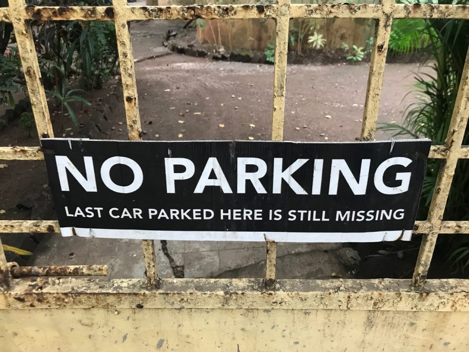 Si je suis à la recherche d’une place où garer mon auto, je préfère une déception devant un panneau “No Parking” plutôt qu’une injonction comminatoire comme “Défence de Stationner”. Mais si en plus, il y a de l’humour comme pour consoler et presque s’excuser, j’approuve même le propriétaire du panneau. La photo ci-dessus est un très bel exemple de cet humour consolant. Le panneau qui me reste en mémoire depuis longtemps, devant une église, disait “Don’t even think of parking here”. Je n’ai pas insisté sachant que la surveillance divine devait être plus efficace qu’une vulgaire caméra.