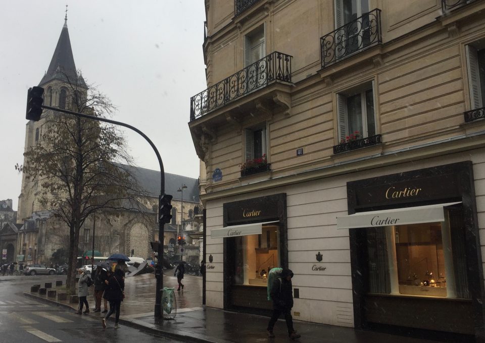 A peine une semaine plus tard, muni de l’avis d’Yvonne et de son parapluie, Ratinet se rendit à nouveau sur place, autrement dit, Place Saint-Germain des Prés. Il traversa le boulevard et se retrouva bientôt devant la vitrine de chez Emporio Armani. L’immeuble faisait l’angle du Boulevard Saint-Germain et de la rue de Rennes. Il portait le numéro 48. Il le photographia. De l’autre côté de la rue de Rennes se trouvait la vitrine de la bijouterie Cartier. Elle portait le numéro 41. Il la photographia.