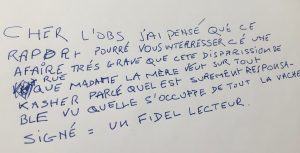—Ah, ben…ben si ! répondit-il tout content. Il y a un article d’Antana… d’Antana… Antanana… de Renaud Dély sur la rue de Rennes. C’est très int… C’est très intéressant et très po…positif sur votre …
