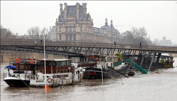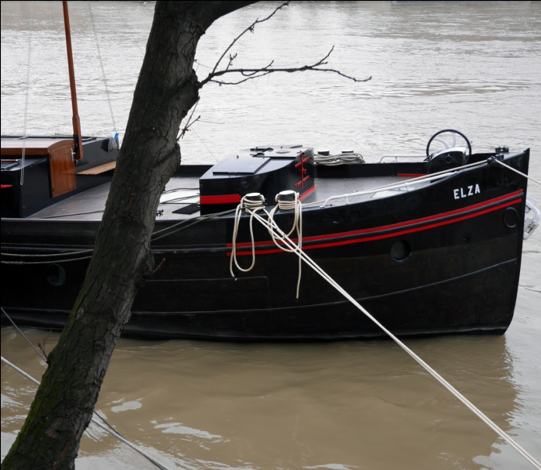 un chapelet de péniches semble abandonné au beau milieu de la Seine