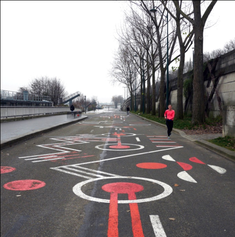 En approchant de la place de la Concorde le paysage s’organise soudain pour le photographe. La Grande Roue bientôt démontée répond aux graffitis colorés sur l’ancienne voie express. A priori tout cela est très laid mais je vais tenter quand même quelques photos. Impossible de prévoir si elles résisteront au temps. Je vais rassurer Jean-Claude car pour une fois je suis abordé pendant ma balade : il s’agit d’un homme de couleur, corpulent et jovial. A sa deuxième tentative, je lui fais un signe réprobateur de la main mais je ne saurai jamais si c’était un illuminé ou un homosexuel ! Tant pis pour moi ! La dame en rouge fluo vient à mon secours et à bon escient