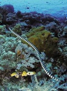 Cette pensée néfaste ne m’aura pas empêché de recommencer à plonger le lendemain, de plus en plus loin, de plus en plus seul. Vers la fin de l’après-midi, je croisais tranquillement au-dessus d’un canyon, quand, au détour d’un massif de corail, je rencontrai un petit serpent tout à fait antipathique. Il me faisait face, il n’avançait pas, mais son corps d’un peu plus d’un mètre de long était animé d’un mouvement sinusoïdal qui lui permettait de rester comme en vol stationnaire entre deux eaux. Il était rayé noir et jaune et n’arrêtait pas d’ouvrir et de refermer sa sale petite gueule en me regardant d’un sale air.