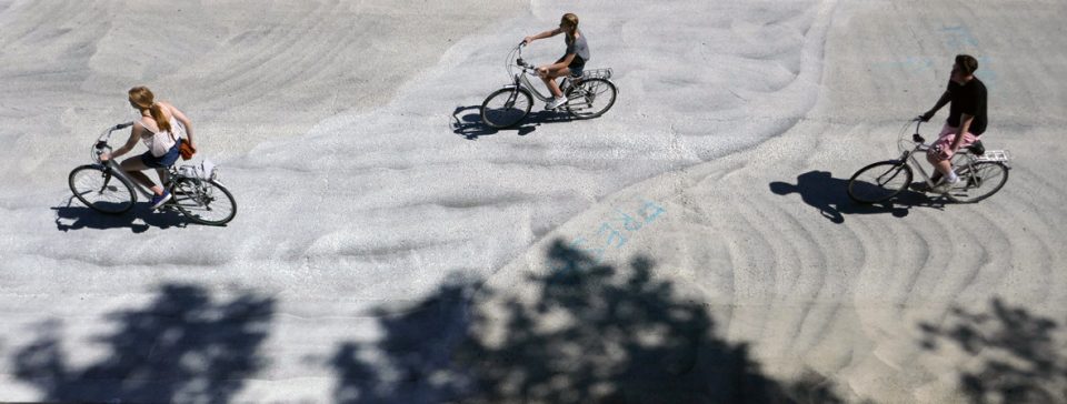 L’ombre du cycliste de droite est plus allongée que celle des autres. Conclusion : pour le cycliste de droite il est dix sept heures, alors que pour les autres il n’est que treize heures.