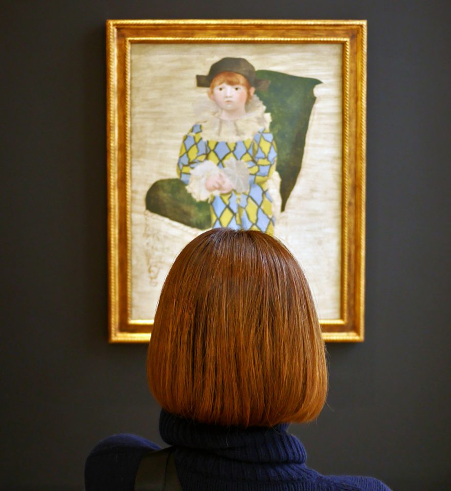 Ma perception de plusieurs peintures a été un peu influencée par les photographies que j’en ai faites avec des personnages les regardant. C’est iconoclaste, je le reconnais. Le petit garçon habillé en clown de Picasso est encore plus dramatique devant cette femme (sa maman ?) aux cheveux raides. Le cheval de Géricault est encore plus pathétique devant la queue de cheval de la visiteuse.