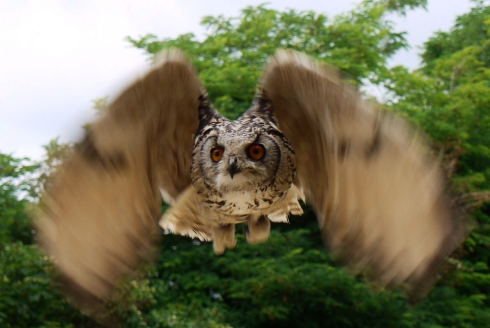 Pas truquée, cette photo a été prise au château médiéval de Chateau-Thierry où chaque année est donné un spectacle dont le titre est « Les aigles de Chateau-Thierry ». On y voit voler en liberté des aigles, des milans, des faucons, es vautours. Ici, c’est un Grand-Duc qui passait au dessus de ma tête. L’effet de flou des ailes par rapport à la netteté de la tête est un pur hasard.