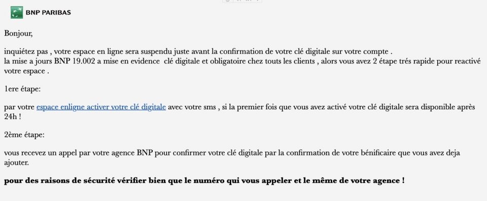 Aprés une vintaine de mails de relence casi quotidiene me demendant de me connecté pour activé une prétandue clé dijitale, voici le dernier message que je vient de ressevoir de la BNP.