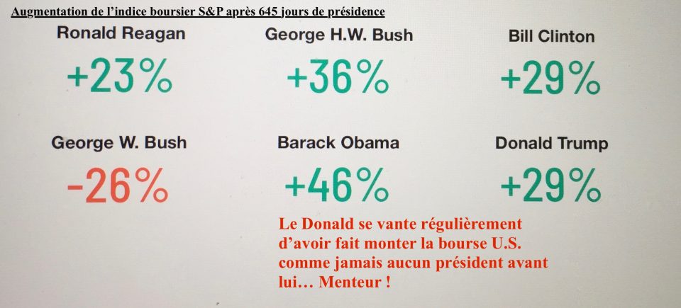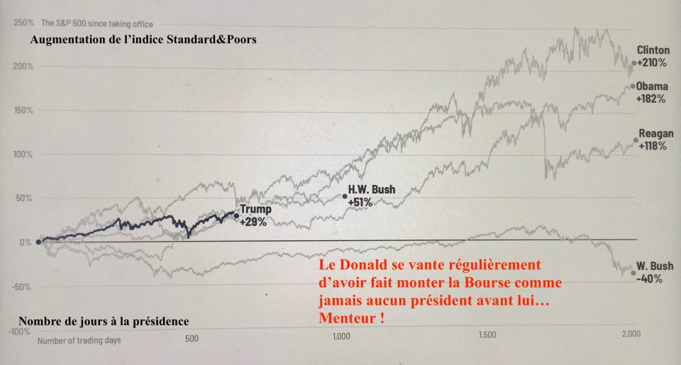 Le Donald se vante de tout, tout le temps. Comme je ne sais plus quel personnage du Petit Prince, il se vante de faire lever le soleil chaque matin. Quelques mois après le début de son mandat, il s’était même vanté de la réduction du nombre d’accidents d’avion qu’il avait attribuée à ses directives à l’Aviation Civile. Tous les jours, il se vante de la croissance de l’économie américaine. Ce n’est pas toujours faux, mais en ce qui concerne la Bourse US, ça l’est. Voyez-donc :