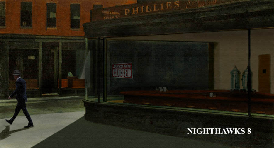 Et pour terminer cette série, voici la huitième version de Nighthawks. Certains spécialistes ont émis des doutes sur l’authenticité de cette version. D’autres pensent qu’elle constitue le résultat inéluctable en même temps que l’aboutissement parfait des hésitations du peintre. Personnellement, qu’elle soit de Hopper ou d’un contrefacteur m’est totalement indifférent.