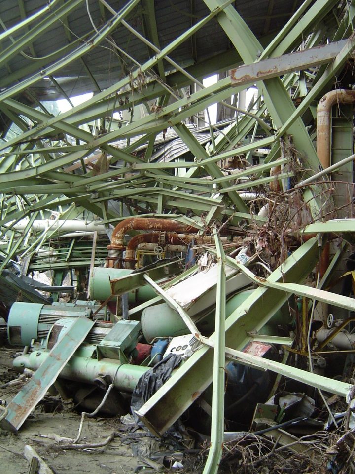 Malgré les quelques semaines écoulées depuis le tsunami, le spectacle, tout d’abord vu de l’avion en approche puis du gros Toyota qui nous emmène à l’usine, est encore terrifiant : des quartiers entiers, devenus plaines rases recouvertes d’une boue noire hérissée de cocotiers tronqués et de pylônes tordus ; dans les zones un peu plus élevées qu’une vague moins furieuse avait envahies, des immeubles modernes effondrés, des gravats partout, des objets insolites disséminés : autocars retournés, bateaux échoués, réfrigérateurs vagabonds… Au Sud-Est de la ville, les camps de réfugiés sont installés sur de petites hauteurs, couvertes de jungle et remplies de tentes et de Land Rovers. Quelques kilomètres plus loin, nous apercevons une énorme barge pleine de charbon à côté de son remorqueur. Les deux bateaux sont posés bien à plat sur la route qu’ils barrent complètement. Le trafic a déjà créé une piste d’évitement.
