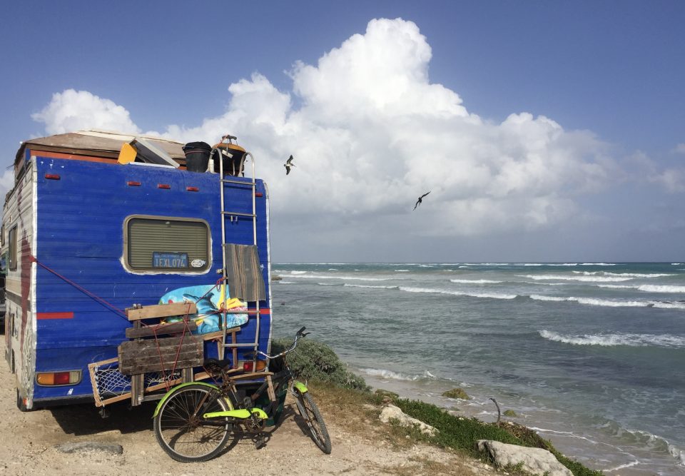 Tulum, au Mexique ! J’aime bien le bleu du camping car qui rappelle la mer et j’imagine la personne qui a ce camping car, bohème, sportif et libre !!!!