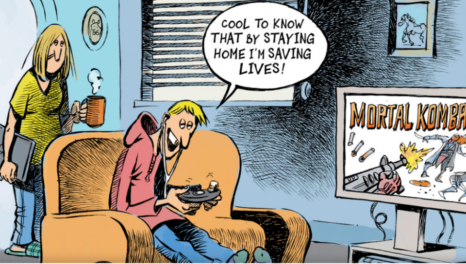 — C’est chouette de savoir qu’en restant à la maison, je suis en train de sauver des vies !