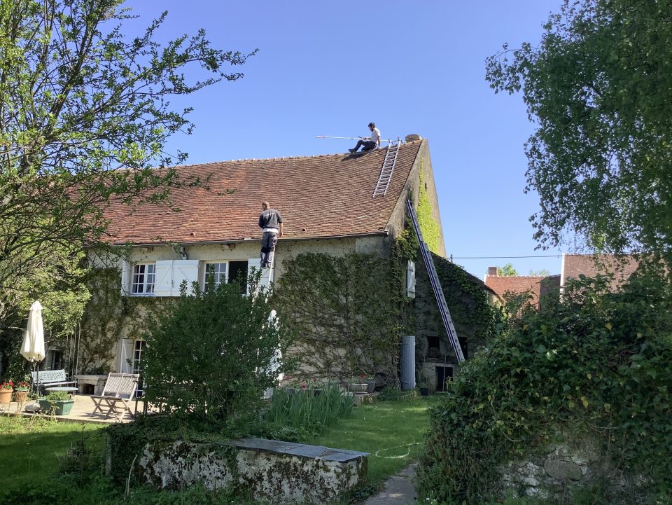 Hier ont commencé les travaux de démoussage et remaniage de la couverture de notre maison de Champ de Faye. C’était l’occasion rêvée d’avoir quelque chose à raconter dans ce fichu Journal de Campagne dans lequel je me suis engagé.