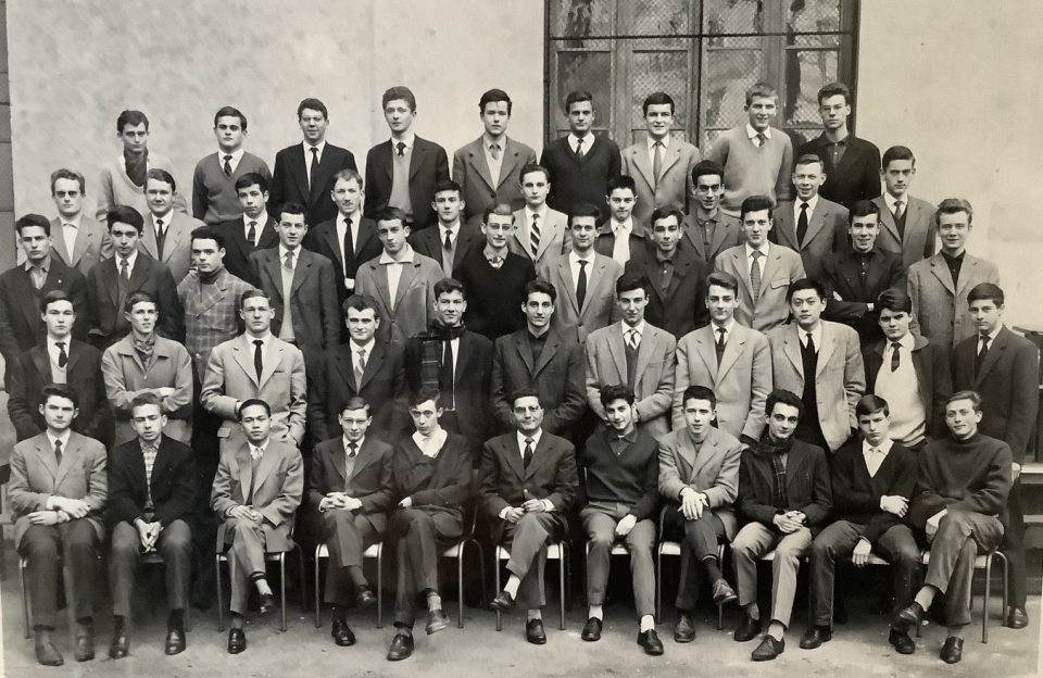 Je me permets d’attirer votre attention sur le cinquième individu en partant de la gauche au troisième rang. On peut noter dans son attitude et son accoutrement quelques traits de personnalité ou quelque volonté de les afficher. L’ample veste en velours côtelé qui contraste par sa couleur et ses formes molles avec les vestons classiques du reste de l’orchestre distingue celui qui la porte du reste du troupeau en affirmant qu’il est un intellectuel en puissance parmi une bande de matheux en devenir. Le polo en laine, très peu porté à l’époque, et surtout son grand col ouvert (mais boutonné, sans doute à la demande du photographe) débordant largement sur les revers de la veste dénotent un côté artiste naissant, probablement non encore révélé. Enfin la position de la tête, légèrement penchée, et le sourire narquois à peine esquissé sont les signes d’un esprit critique déjà assez développé, sans réelle impatience ni condescendance, mais sans complaisance non plus vis-à-vis de cette vieillotte coutume photographique. Enfin, le langage du corps, et plus particulièrement le chiasme de la ligne des épaules avec l’horizontale (épaule droite légèrement plus basse que la gauche) signifie clairement à qui veut bien voir que, sitôt que le petit oiseau sera sorti, l’intéressé n’aura de cesse de quitter les rangs pour retourner en classe de maths ou pour s’enfuir au Luxembourg, dont octobre 1959 fut l’un des plus beaux mois. On regrette de ne pas apercevoir le pantalon, probablement de flanelle grise, probablement foncée, ni les chaussures, certainement des Sebago rouges sans glands, qui confirmeraient chez le personnage une légère trace de bourgeoisie (la flanelle grise) mêlée de fantaisie (les Sebago rouges), caractéristiques qui ne sont contradictoires qu’en apparence, et dont jamais il ne se défera (des traces, pas du pantalon ni des chaussures).