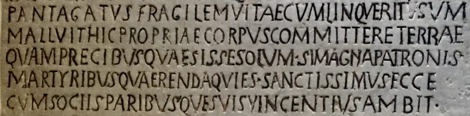 Ce Pantagatus semble avoir « abandonné l’usage de la vie fragile ». Il est encore question du « repos qui doit être recherché par les saints patrons Martyrs » et du « très saint Vincent qui déambule autour avec ses associés et égaux » … Autour de qui, de quoi ?