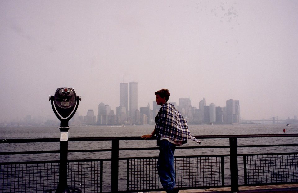 Photo romantique : jeune homme seul dans la brume: face aux tours….et rêvant déjà à son avenir américain ?