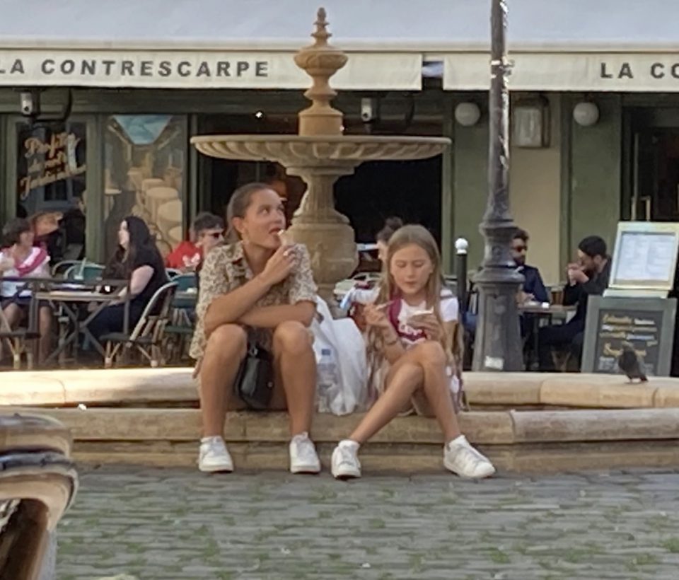 Je vous avais fait part un jour de mon inquiétude de voir se prolonger la fermeture de Delmas. J’anticipais une faillite, un rachat par une agence immobilière, le pire quoi ! Mais non, la serveuse m’apprend qu’au cours des travaux de rénovation qui étaient prévus pour trois mois, l’immeuble s’est affaissé. Il a donc fallu le conforter, ce qui a pris 18 mois de plus. Mais ça y est, c’est fini, c’est ouvert. Vous pouvez venir y repenser votre argent. Je vous aurai bien donné une photo du nouveau Delmas, mais j’ai préféré vous montrer celle-ci, celle de deux sœurs dégustant une glace au bord de la fontaine. J’ai trouvé que c’était plus joli.