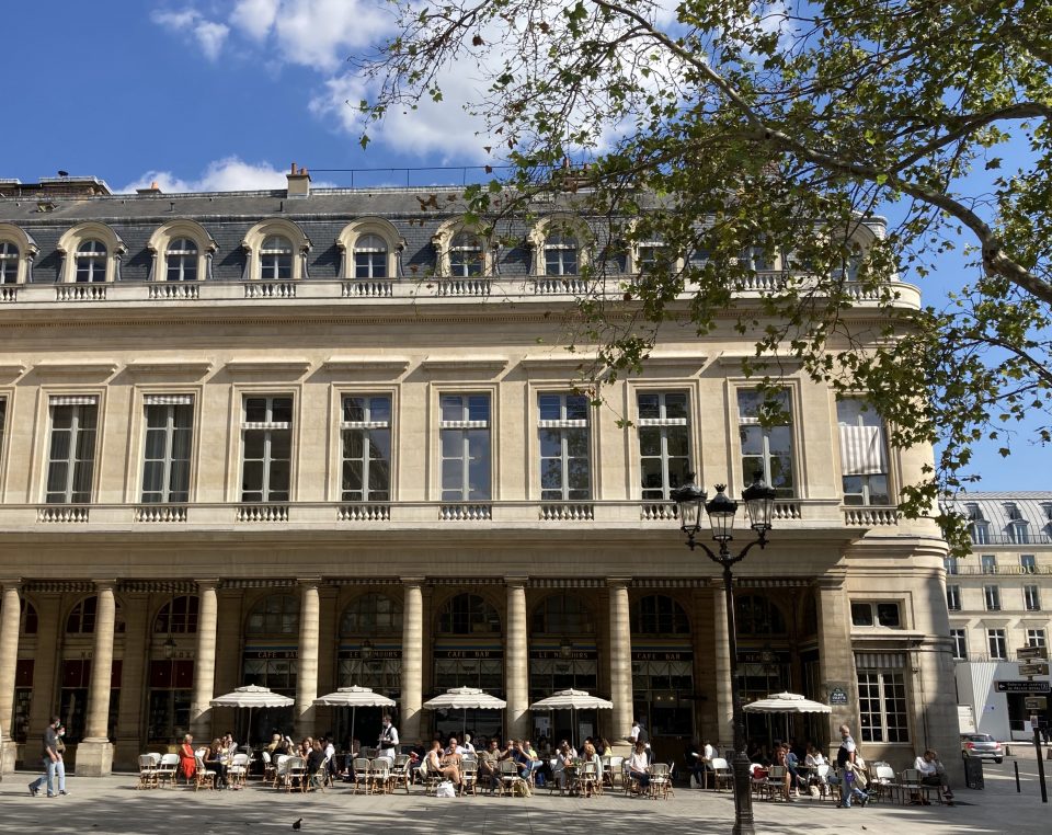 Mon but était aussi de parcourir le quartier à la recherche d’une brasserie d’époque où mes deux héros pourraient étancher leur soif d’après Chabanais. Alors, j’ai traversé les Jardins du Palais-Royal, négligeant le Grand Vefour, trop chic et trop cher pour ce que j’envisageais comme rencontre. J’ai passé les colonnes de Buren et leur lot de touristes (il en reste) perchés dessus pour la photo, et me voici devant la Comédie Française, en plein soleil. Et si vous faites comme moi, vous y trouverez Le Nemours, dont voici la photo. Décor parfait pour la scène que j’envisageai. Vous verrez. J’ai donc adopté le Nemours, sans pouvoir m’y arrêter : aucune table libre.