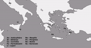 Mais quand son cousin Mynias, le marin de Pyrgos, était revenu de Malte, il lui avait appris ce qu’il était advenu de Carthage : trois mois auparavant, après trois ans de siège, les quatre-vingt mille hommes de Scipion avaient pris la ville. Dix jours de combats de rue acharnés avaient fait plusieurs dizaines de milliers de morts parmi les défenseurs ; la ville avait brulé pendant six jours, ensevelissant les habitants sous les décombres ; plus de cinquante mille Carthaginois, principalement des femmes et des enfants avaient été réduits en esclavage et ce qui restait de la ville avait été arasé à la charrue. Alors Sthennis avait décidé de quitter Corinthe immédiatement. Dans la nuit, sans rien dire à ses voisins de ce qu’il venait d’apprendre, il avait préparé à la hâte sa petite caravane et quitté la ville à l’aurore. Dans l’urgence et la précipitation, il n’avait pu emporter que quelques vêtements, des couvertures et de la nourriture pour deux jours, sans oublier tous les bijoux et tout l’argent qu’il avait pu trouver dans la maison et qu’il avait rassemblés dans plusieurs coffres de bois accrochés aux flancs de l’une de ses mules. Mais il avait dû laisser tout le reste derrière lui, les meubles et les statues qui ornaient sa maison, les inventions qui illustraient sa carrière, et l’incroyable objet que le père de son père avait reçu un jour d’un marin maltais, qui le tenait d’un pêcheur, qui lui-même l’avait reçu de ce légendaire mathématicien, Archimède de Syracuse. Le père de Sthennis lui avait fait jurer de tout faire pour conserver cette machine et surtout pour l’empêcher de tomber aux mains des romains. Mais entre un coffre d’argent supplémentaire et la machine d’Archimède, Sthennis avait choisi l’argent.