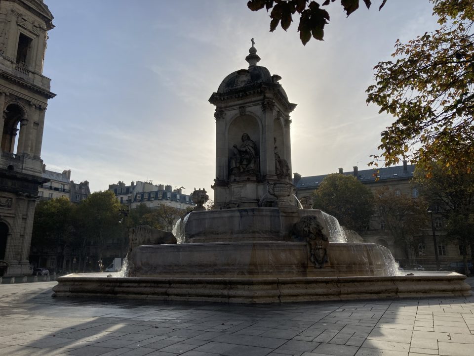 Et maintenant, l’apothéose, l’épiphanie toujours renouvelée, la surprise habituelle : je débouche sur la place Saint Sulpice ! Je fais face au soleil et la lumière éblouissante m’empêche de voir la fontaine en contre-jour. Je m’approche et sa silhouette se détache, noire sur le blanc du ciel. Les vapeurs d’eau qui s’en échappent flottent un instant en un léger brouillard qui plane vers la Mairie sans parvenir pourtant à traverser la rue Bonaparte. Un banc m’accueille.