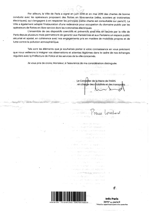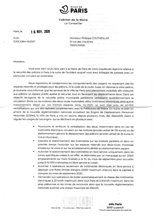 Bon, eh bien, c’est au tour de l’Hôtel de Ville de me répondre. Le 16 novembre, Monsieur Pierre Lombard, conseiller de la Maire de Paris en charge des mobilités et des transports (on appréciera le mot mobilité qui remplace celui de circulation) m’a adressé un courrier.
