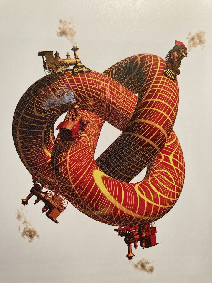Il n’est pas possible de courber l’espace sans impliquer également le temps. Par conséquent, le temps a une forme. Cependant, il apparait qu’il a aussi une direction, comme les locomotives l’illustrent sur le dessin.