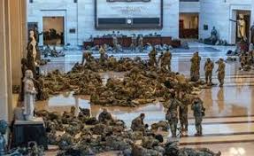 Les oies d’aujourd’hui cacardent de façon alarmante, vraiment très alarmante, mais la menace semble prise en compte et 25000 Gardes Nationaux sont en place à Washington. Tout autant que les images de l’insurrection d’hier, resteront dans les mémoires celles des soldats en tenue de combat se promenant dans les couloirs majestueux ou dormant allongés sur le marbre vénérable en attendant l’assaut qui viendra demain peut-être du désert des Tartares.