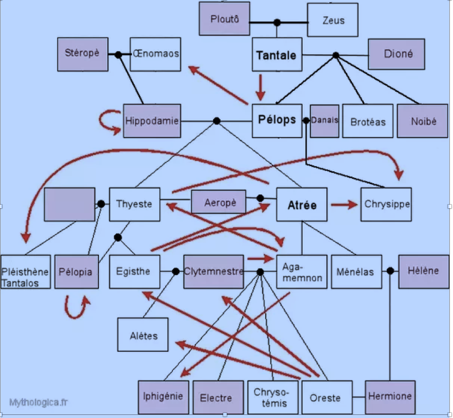 Tout commence avec Tantale qui n’a rien trouvé de mieux à faire que de faire cuire son fils Pélops et de l’offrir aux Dieux afin de tester leur perspicacité. Seule Déméter se laisse prendre et dévore une épaule. Horrifiés les Dieux ressuscitent Pélops et condamne Tantale au supplice du même nom : précipité aux Enfers, il est plongé dans un lac, environné d’arbres chargé de fruits qu’il ne peut atteindre car l’eau et les fruits s’éloignent de lui dès qu’il veut les atteindre. Tantale est donc condamné à une soif et une faim éternelles.