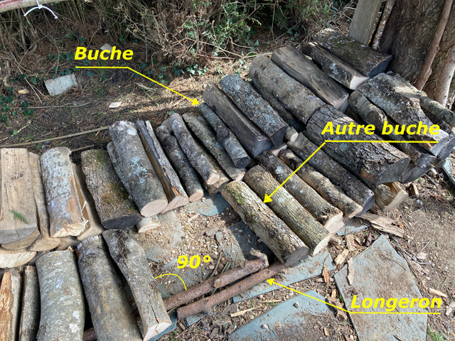4- Au point où nous en sommes, nous disposons d’un abri encadré par deux arbres propices ou par de solides pieux, et sous cet abri, d’un sol plat, et sur ce sol, d’un faisceau de longerons parallèles, d’un monceau de buches en vrac, d’une paire de mains gantées et d’une bonne forme physique. Il s’agit à présent de prendre les buches une par une et de les placer délicatement et perpendiculairement sur et aux longerons de manière à constituer une première couche de buches. De cette phase délicate dépendra le bon rangement ultérieur du reste des buches. On ne tardera pas à comprendre pourquoi (peut-être).