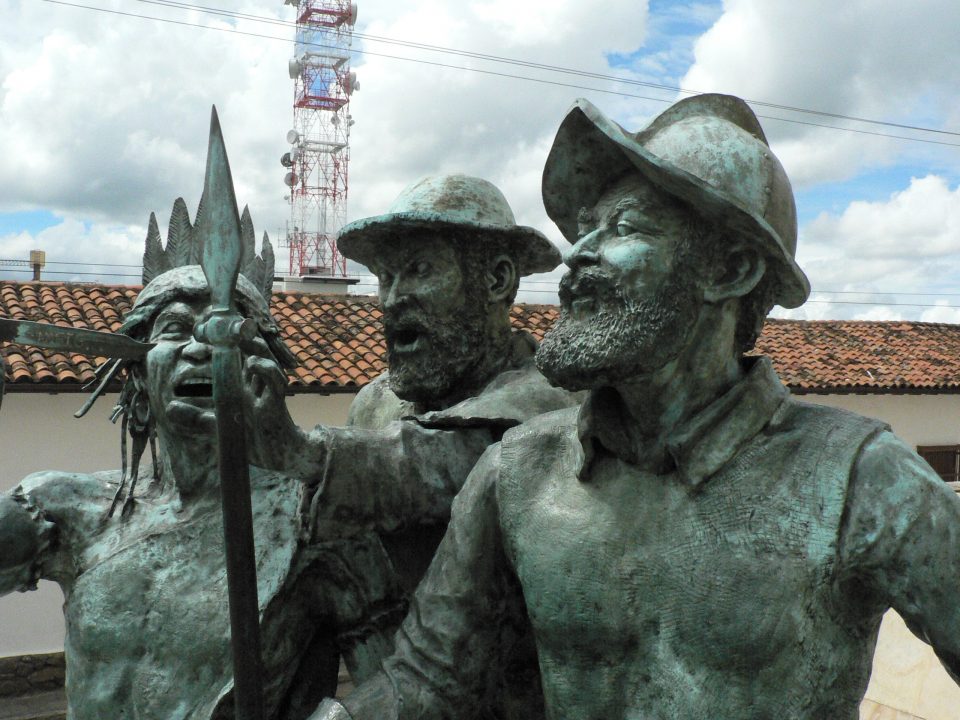 Où l’on voit le fier et pacifique conquistador menacé par un méchant andin, sans foi ni loi.