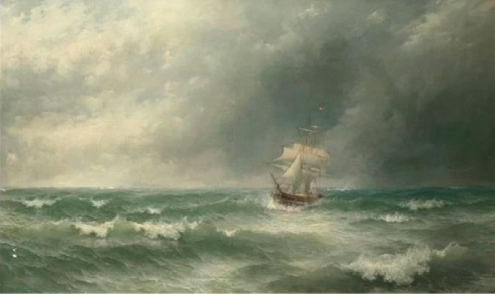 Enfin, pour illustrer mon propos, ci-dessous un tableau du peintre anglais David James, pas très connu, mais qui savait magnifiquement peindre la mer et ses vagues tout comme son contemporain Joseph Conrad.
