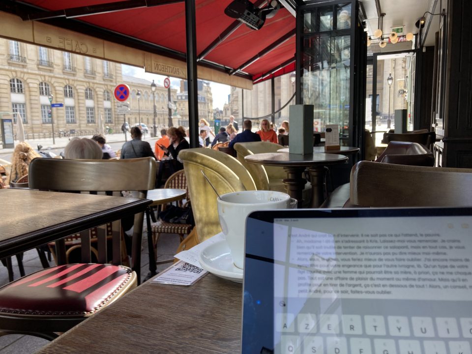 On peut tirer plein de choses de cette photo bureaucratique indépendamment de l’emplacement du café. Bien sûr on voit les colonnes du Panthéon, La Sorbonne et sa bibliothèque, on voit un QRcode pour commander sa pitance, etc, mais ce qui m’interpelle c’est le texte sur l’écran. Je le reconnais pour l’avoir lu il n’y a pas si longtemps. Une sombre histoire de chantage, d’homme qui couche avec une femme qui pourrait être sa mère, et ce pauvre André qui ferait mieux de se faire oublier. Oh là là! C’est là l’intérêt de la photo, c’est comme lire le journal, ou une lettre, par-dessus l’épaule de son voisin, yeuter quoi!