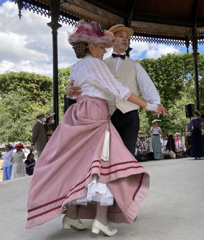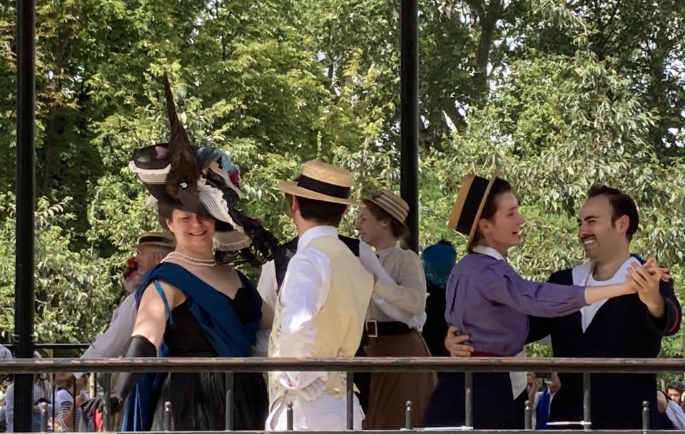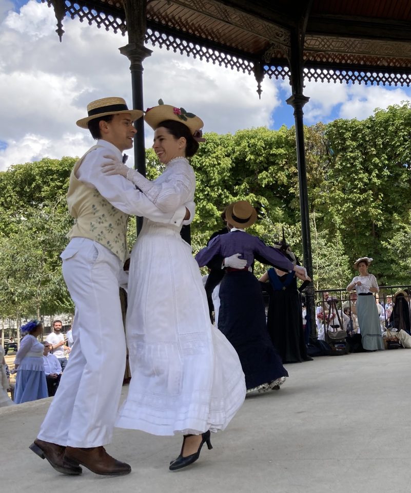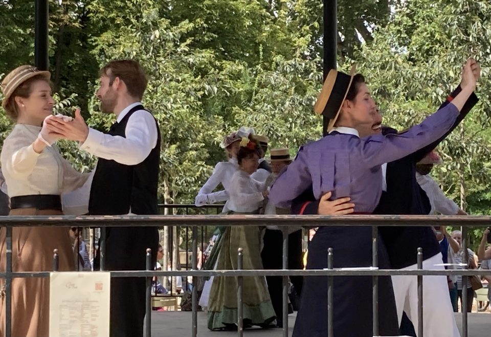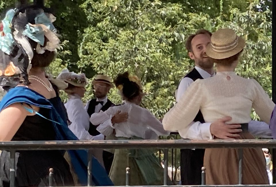 Je passai les grilles d’entrée et me dirigeai droit vers le kiosque à musique. Il était entouré d’une foule débonnaire au sein de laquelle je me faufilai pour approcher de la scène. Sur l’estrade du kiosque, sur une musique entraînante diffusée par un système acoustique de grande qualité et sous le regard émerveillé des spectateurs, une douzaine de couples dansaient. Ils dansaient en souriant, joyeux, légers, insouciants, comme on devait danser à l’époque où les costumes qu’ils portaient étaient de mise, comme on voit encore danser sur les toiles de Renoir. Ils enchainaient polkas, quadrilles, valses, mazurkas, cake-walks, puis s’arrêtaient quelques minutes pour reprendre leur souffle. Les hommes ôtaient leur canotiers et s’épongeaient le front et les femmes, aux anges, riaient en agitant leurs éventails. Pendant ces intermèdes, on aurait pu croire que tous continuaient de jouer le rôle qu’ils s’étaient assigné. Mais moi je sais qu’ils ne jouaient pas. Je sais qu’en cet instant charmant, sous ce beau ciel d’Ile de France, dans ce décor propice et ces costumes désuets et magnifiques, ils étaient ces gens, leurs ancêtres, qui venaient ici il y a plus de cent ans profiter en dansant de leur époque insouciante.