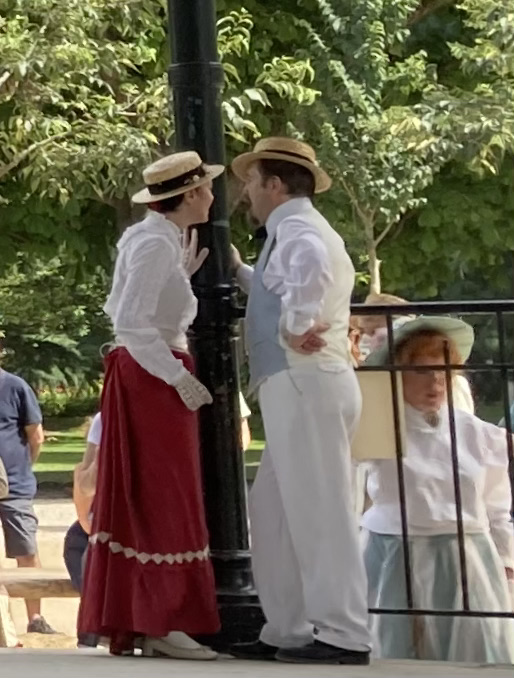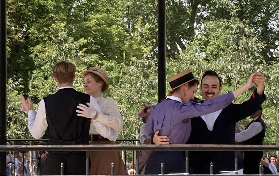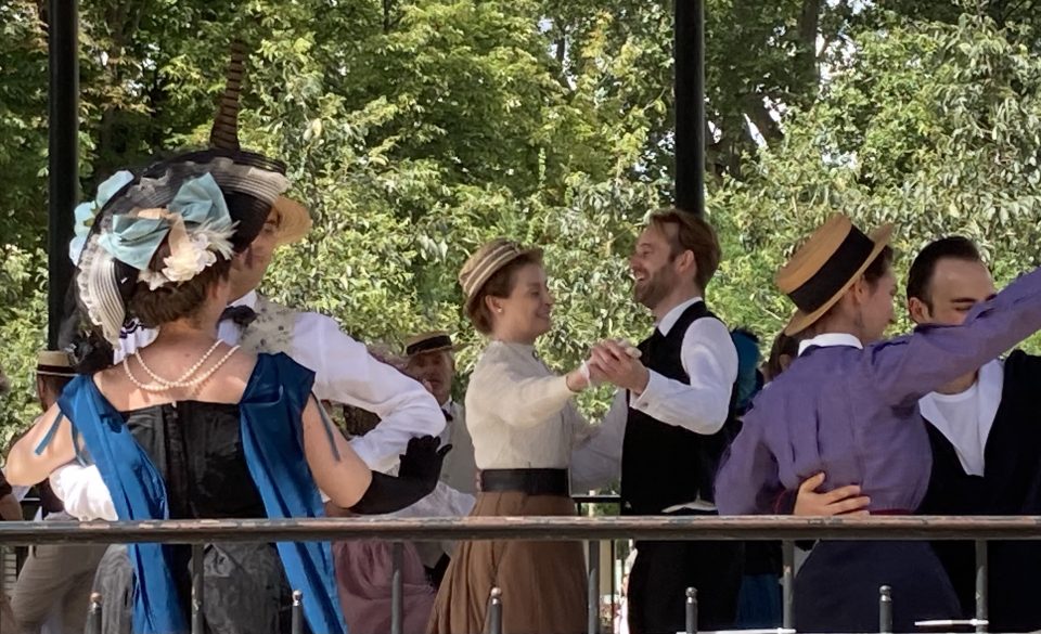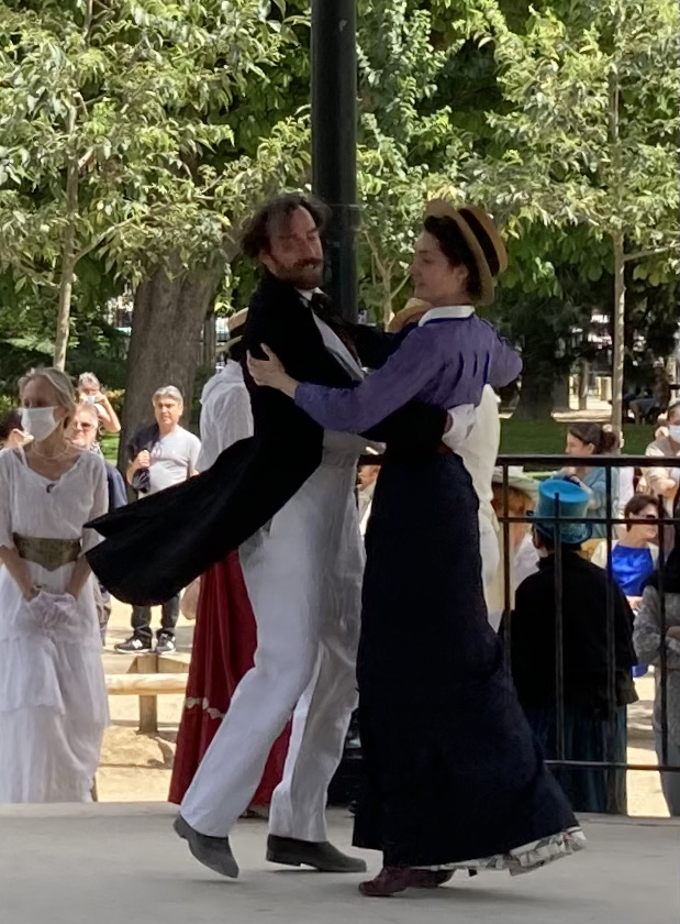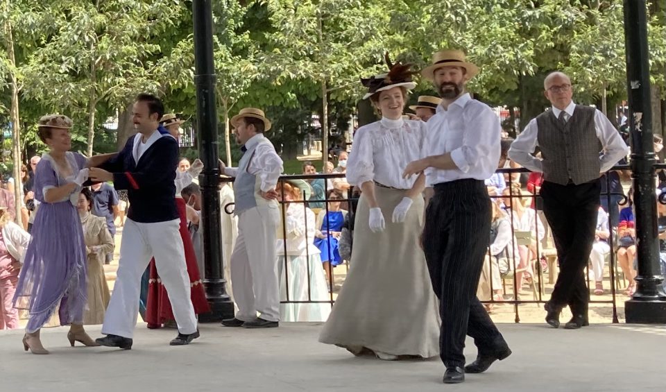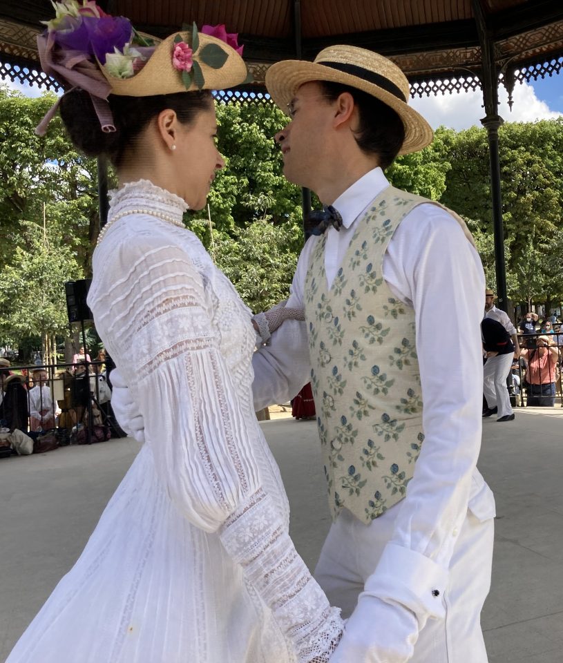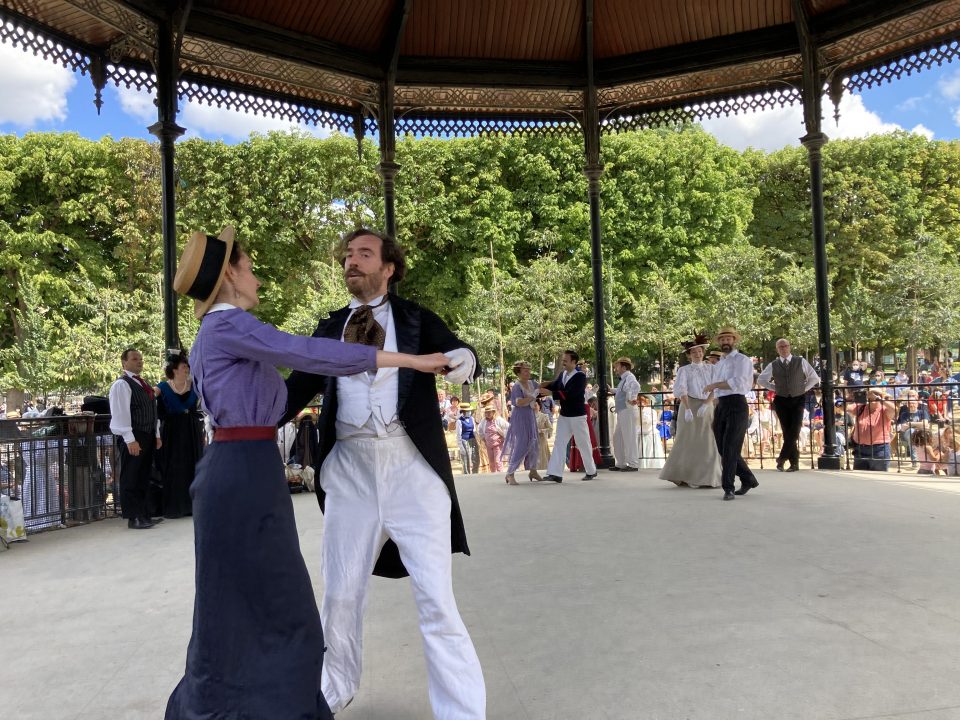Je passai les grilles d’entrée et me dirigeai droit vers le kiosque à musique. Il était entouré d’une foule débonnaire au sein de laquelle je me faufilai pour approcher de la scène. Sur l’estrade du kiosque, sur une musique entraînante diffusée par un système acoustique de grande qualité et sous le regard émerveillé des spectateurs, une douzaine de couples dansaient. Ils dansaient en souriant, joyeux, légers, insouciants, comme on devait danser à l’époque où les costumes qu’ils portaient étaient de mise, comme on voit encore danser sur les toiles de Renoir. Ils enchainaient polkas, quadrilles, valses, mazurkas, cake-walks, puis s’arrêtaient quelques minutes pour reprendre leur souffle. Les hommes ôtaient leur canotiers et s’épongeaient le front et les femmes, aux anges, riaient en agitant leurs éventails. Pendant ces intermèdes, on aurait pu croire que tous continuaient de jouer le rôle qu’ils s’étaient assigné. Mais moi je sais qu’ils ne jouaient pas. Je sais qu’en cet instant charmant, sous ce beau ciel d’Ile de France, dans ce décor propice et ces costumes désuets et magnifiques, ils étaient ces gens, leurs ancêtres, qui venaient ici il y a plus de cent ans profiter en dansant de leur époque insouciante.
