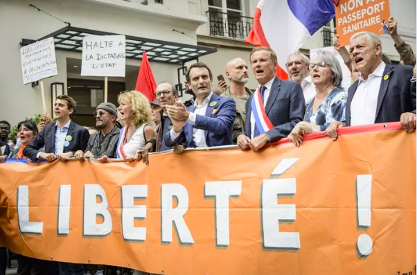 Les manifestants de la photo ci-dessus menés en troupeau par deux leaders rassis en recherche d’existence politique verront dans la morale de cette fable l’apologie de la liberté individuelle, de l’indépendance vis à vis de ceux qui ont choisi la liberté de vivre en société dont « le but est le bonheur commun » . Moi je les invite – mais serait-ce possible? – à lire la Constitution (Révolutionnaire!) de 1793 et sa Déclaration des Droits de l’Homme et du Citoyen, laquelle pourtant devrait être leur bible.