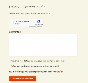 Rassurez-vous, moi je le sais, mais la machine ne le sait pas et elle est méfiante de nature. Alors, cliquez sur la case indiquée, attendez quelques secondes et si tout va bien, c’est que vous n’êtes effectivement pas un robot et que vous pouvez envoyer votre commentaire. Il arrivera aussi parfois que le machine vous demande de reconnaitre un feu rouge, un bateau ou une motocyclette. Avec un peu de révisions préalables, vous devriez vous en sortir. Et si, par extraordinaire la machine n’acceptait pas votre affirmation, je vous conseillerais de consulter votre médecin.