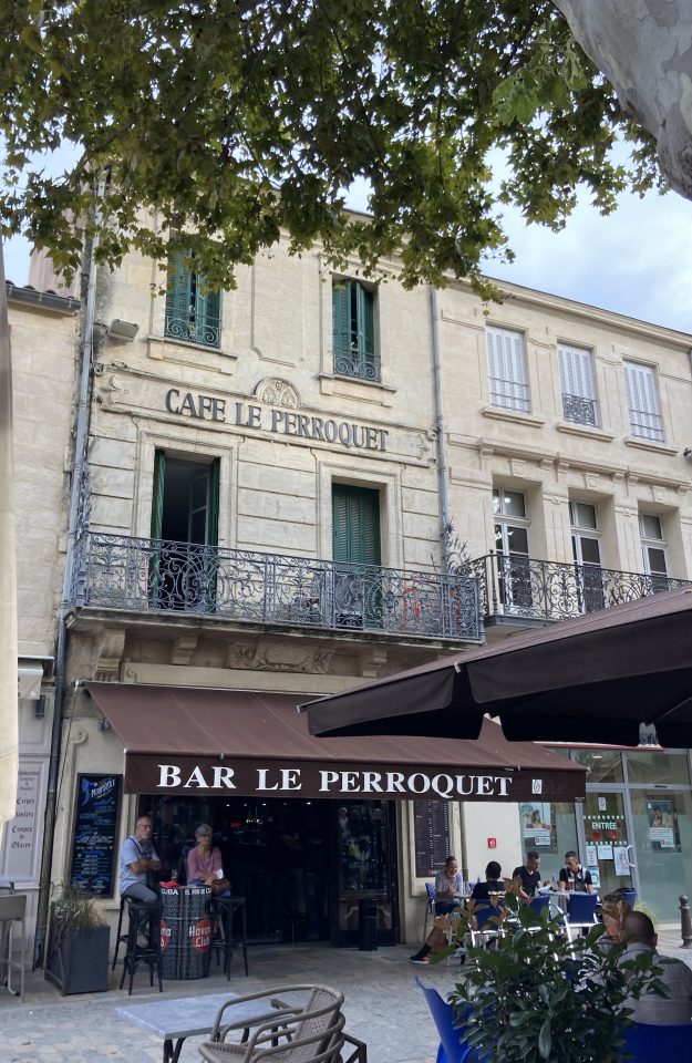 Le Café Le Perroquet, habilement sous-titré Bar Le Perroquet, se situe à coté de la mairie sur la Place Saint-Louis, au milieu des remparts d’Aigues-Mortes ; un endroit qui me plairait bien comme bureau annexe, lieu d’écriture au calme sous les grands platanes, si ce n’était pas si loin de Paris.