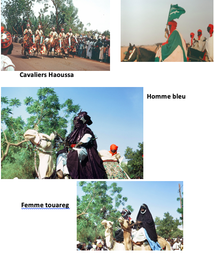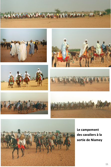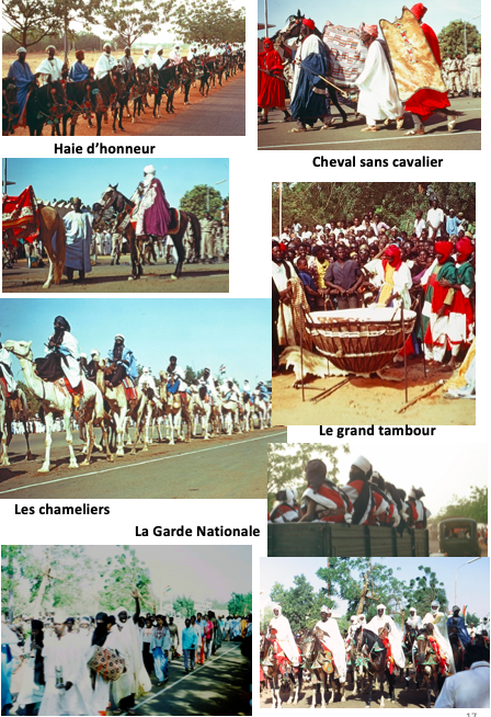 Le défilé grandiose commence, tout le Niger est représenté, chaque ville, village, bourg a envoyé ses cavaliers. Ils sont tous partis depuis des semaines. Pour ceux du nord et de l’extrême nord du pays ce sont les chameliers d’Agadez (Agadez est à 950 km de Niamey). Puis ce sont les militaires, les groupes d’hommes costumés, de femmes avec de beaux vêtements. Il y a ensuite tous les corps de métier : les potiers, les menuisiers, les bouchers… cela se passe dans l’ordre sans blanc, presque parfait.