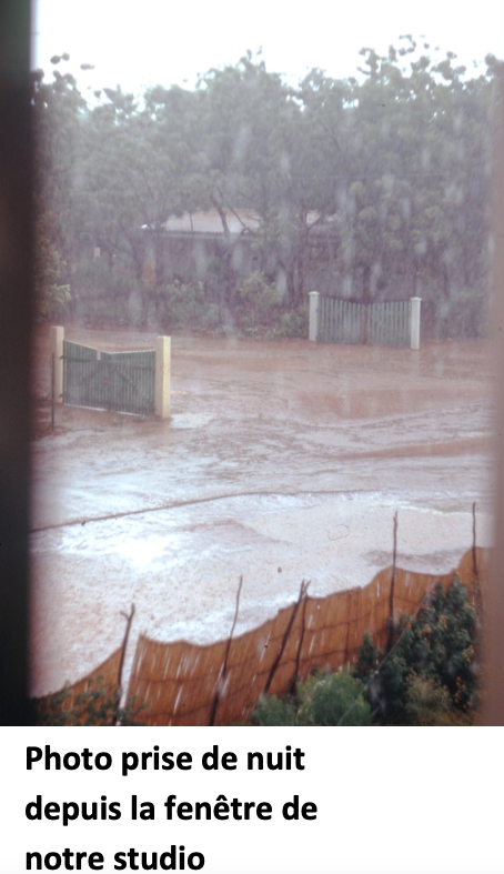 L’année 1973 a été marquée par une période de grande sécheresse. Tout le monde attendait désespérément la pluie. Régulièrement la nuit, nous entendions tonner l’orage avec des éclairs, mais pas d’eau. Une nuit nous vons été réveillés par un violent coup de tonnerre suivi d’averses qui peu à peu se sont intensifiées, créant un bruit assourdissant sur la toiture métallique si bien que nous nous sommes levés pour aller voir tomber la pluie depuis notre balcon. Quel plaisir immense de recevoir ces gouttes d’eau tiède venant du ciel, les premières depuis notre arrivée en Afrique.