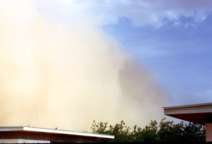 Il y a un phénomène particulier que sont des vents de sable qui se produisent en saison sèche. Cela est très impressionnant car le ciel s’assombrit rapidement et l’air devient irrespirable. Il nous est arrivé en voiture d’être obligé de rouler au pas, phares allumés ou même de devoir nous arrêter compélement. Nous avons subi ces vents presque quotidiennement pendant un mois, rendant le trafic aérien impossible ce qui a eu pour conséquence de nous priver de courrier, seul lien avec la France ! Pendant la même période, il nous est arrivé de croiser de petits cyclones d’une dizaine de mètres de diamètre qui s’élevaient verticalement dans le ciel soulevant des montagnes de poussière et se déplaçant à la vitesse de la voiture.