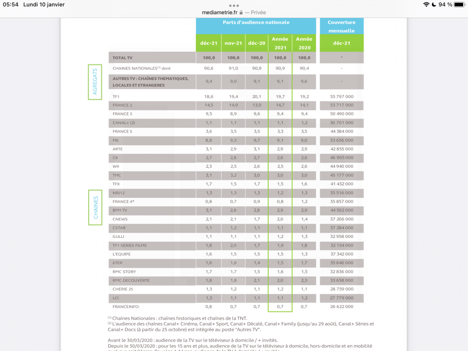 Mais, pour vous rassurer, sachez aussi que l’audience de ces chaines est extrêmement réduite. J’en veux pour preuve le sondage Mediamétrie qui vient de donner les parts d’audience nationale pour l’année 2021 :