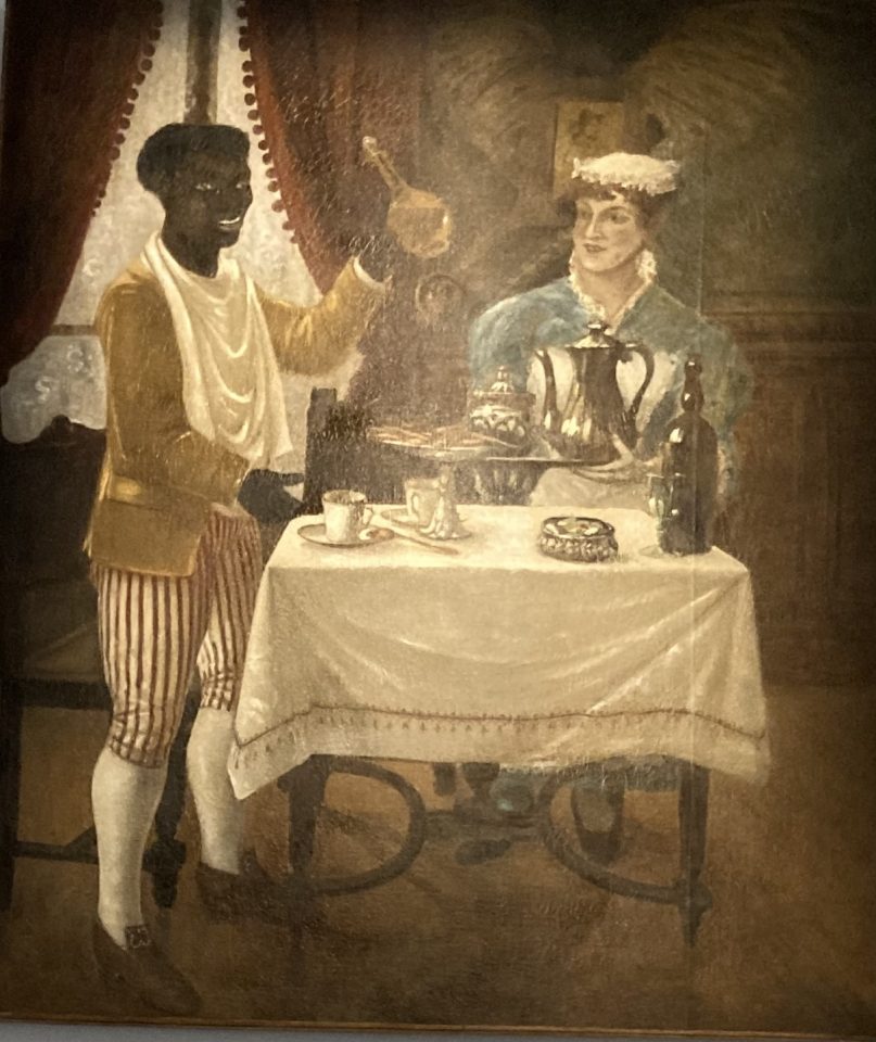 Nous sommes dons en présence d’une scène dans laquelle un homme, noir, et même très vraisemblablement d’origine africaine ou antillaise, habillé en gentilhomme, est servi très respectueusement chez lui par une employée de maison, blanche, de type caucasien et même très vraisemblablement d’origine bretonne. Il s’agit donc d’une scène diamétralement opposée — ou inverse, si vous voulez, et mathématiquement c’est mieux — au schéma esclavagiste classique des rapports Noirs sur Blancs.