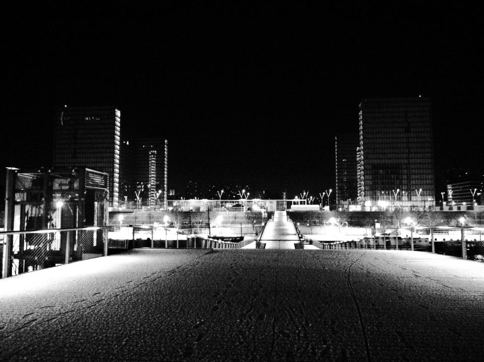 Il faut vraiment des conditions très particulières pour arriver à trouver belle cette foutue batisse. Ici, tôt le matin après une nuit de neige, le contraste efface presque entièrement les quatre livres ouverts, lourd symbole de l’usage des bâtiments.