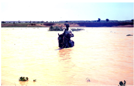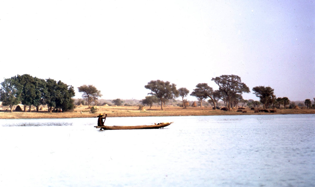 Un matin nous avons chargé la pirogue comme à l’habitude avec notre matériel et deux bornes de 80 kg. Au milieu du fleuve, une jointure entre deux planches, étanchées avec de la fibre végétale, commença à fuir. Malgré nos efforts pour écoper sans relâche, la situation s’aggravait et nous n’arrivions plus à évacuer toute l’eau. Arrivés à grand mal sur la berge de l’ile, nous eûmes juste le temps d’évacuer l’embarcation avec une partie du matériel… et la pirogue sombra avec une borne dans 1,5m d’eau. Le piroguier faisait grise mine. Nous avons travaillé toute la journée en bordure du fleuve. Nous nous interrogions sur notre retour. De plus, il y avait une faune importante et de temps en temps nous dérangions un caïman qui se glissait dans le lit de la rivière, ce qui n’avait rien de rassurant. À la fin de la journée pas de pirogue en vue. Il nous fallait donc envisager à traverser par nos propres moyens. Nous avons repéré un gué, par lequel les gens du village passaient. Mes gars m’avaient bien conditionné en me disant que les caïmans les connaissaient eux, les noirs, mais que, une peau blanche pouvait être une proie facile ! Je ne savais pas s’il fallait les croire. J’étais inquiet. Par prudence, je commençais à les faire traverser avec le matériel sur la tête. L’un portait la sacoche de mon appareil photo dans laquelle j’avais placé mon portefeuille. Avec le reste de l’équipe, j’envisageais que l’on traverse tous ensemble, moi au milieu pour être protégé de tout éventuel caïman mangeur de blanc ! C’est alors que j’aperçois sur l’autre rive, non loin de la Land Rover, un cheval avec son cavalier : une chance. Je lui fais signe de traverser. Il ne me comprend pas, nous sommes trop loin l’un de l’autre. J’envoie un de mes gars à sa rencontre, j’avais peur qu’il m’échappe. Il me rejoignit sur l’autre rive. Je n’avais plus qu’à traverser avec le cheval. L’animal avançait lentement dans le fleuve. Lorsque je sentis qu’il commençait à nager, je me suis alors allongé de tout mon long sur son dos pour flotter et le soulager.