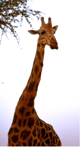libres dans leurs déplacements mais nous sentions aussi leur inquiétude en nous apercevant. Nous tentions de nous approcher de ces géantes sans savoir qu’elles pouvaient être redoutables. J’ai appris bien plus tard que les girafes pouvaient charger vers le danger et talonner avec leurs grandes pattes pour se défendre. Nous sommes revenus au mois de mai, sensiblement au même endroit et les avons retrouvés. Chantal a pu s’approcher de très près d’un grand mâle. Les photos donnent l’échelle de l’animal. J’ai essayé, moi aussi, de m’en rapprocher pour faire de gros plans photographiques.