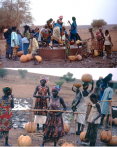 Pour profiter de la découverte de la région, en fin de journée il arrivait que nous ne rentrions pas directement et allions visiter un village, un point d’eau animé par les femmes puissant l’eau. Le puits est un véritable lieu de vie. Les femmes de s’y rendaient le matin au lever du jour et en soirée avant le coucher du soleil. A côté du puits de Guidanmagagi la tradition voulait que les femmes mariées aient une tenue bleu-roi, avec un foulard noir sur la tête. Après avoir puisé l’eau, elles remplissaient de grosses calebasses qu’elles portaient ensuite soit sur la tête, soit sur