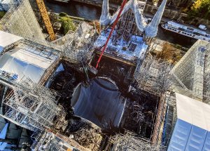 L’incendie d’avril 2019 n’y est traité qu’assez rapidement et de façon peu spectaculaire, mais l’exposition insiste surtout sur les travaux de préservation, de confortement et de restauration qui sont en cours depuis trois ans. C’est selon moi la partie la plus intéressante de l’exposition. Elle permet de découvrir l’incroyable ampleur, l’énorme difficulté et la haute technicité des travaux engagés.