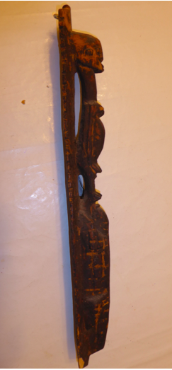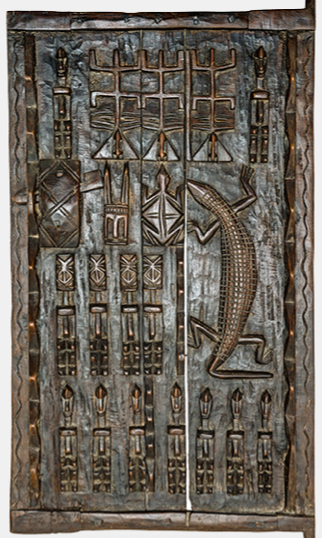 Il doit s’agir d’un objet rituélique : probablement la trace noire encore existante aujourd’hui sur sa surface doit être du sang de poulet sacrifié pour un rite. Le symbole du caïman est important chez les Dogons. On le retrouve sur beaucoup de sculptures, en particulier sur les portes des greniers à mil.